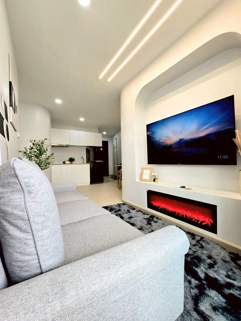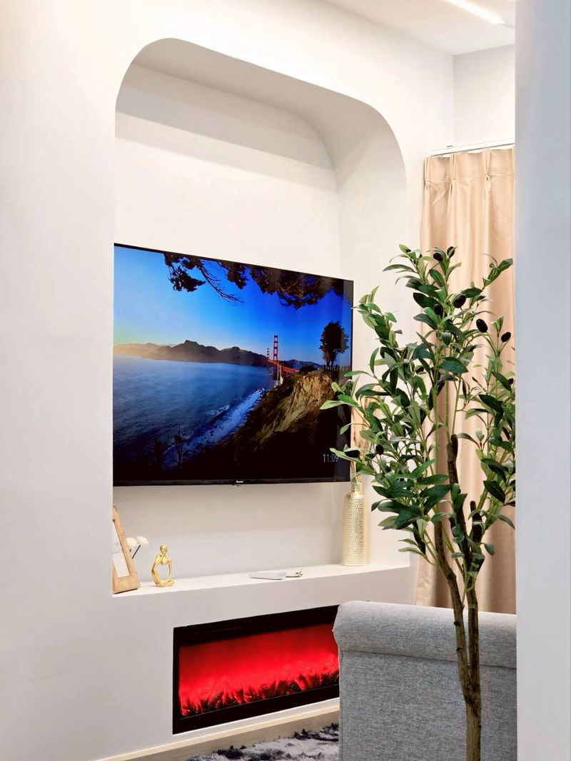 เตาผิงไฟตกแต่งพร้อมชั้นวางทีวี