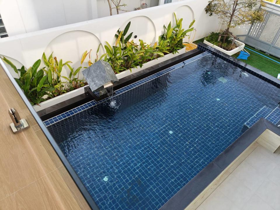 สระว่ายน้ำ 9.9 ม. x 4 ม. (สระว่ายน้ำล้น ระบบเกลือ) มีระบบจากุชชี่นวดตัว พร้อมชุดน้ำตก