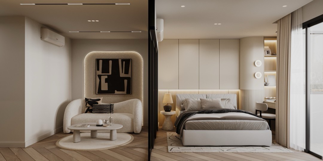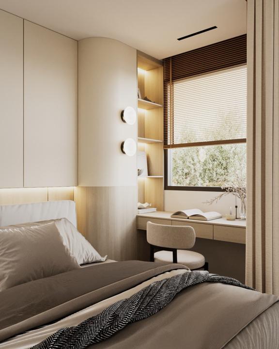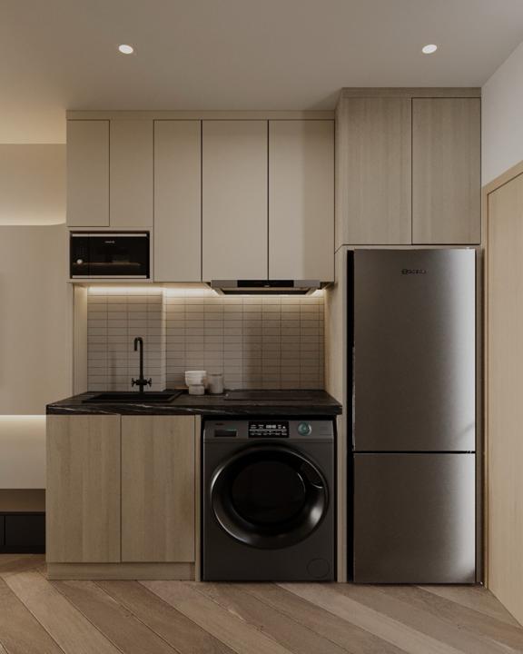 บิ้วอินเฟอร์นิเจอร์ครบ – ตู้เสื้อผ้า + โต๊ะเครื่องแป้ง + ชุดครัวพร้อมเตาไฟฟ้า & ฮูดดูดควัน
