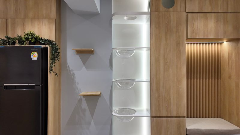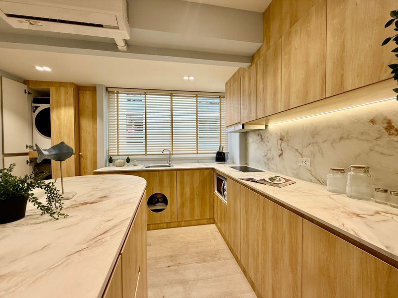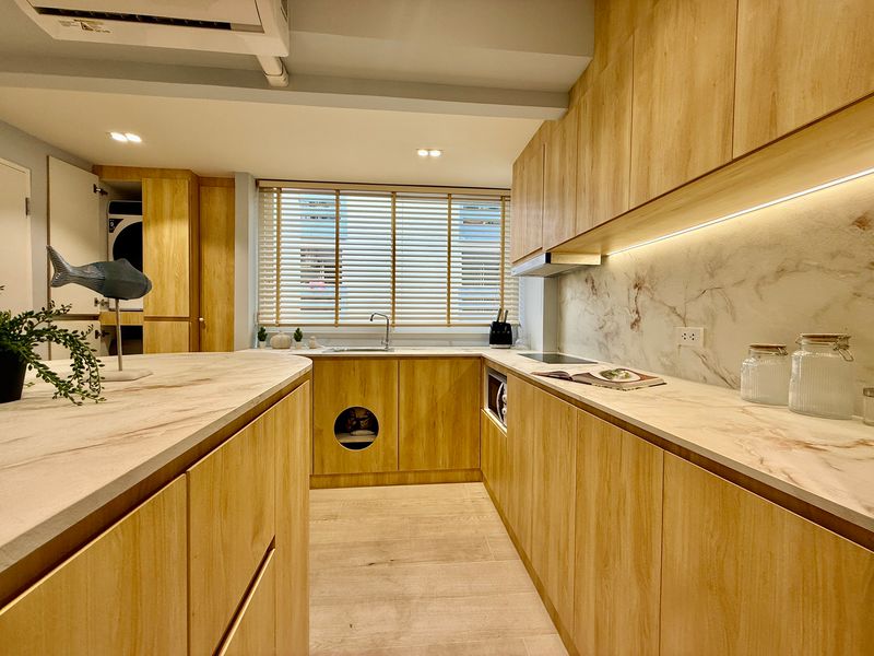 • ชุดครัว Built-in พร้อม เตาไฟฟ้า + เครื่องดูดควัน + ไมโครเวฟ + ตู้เย็น