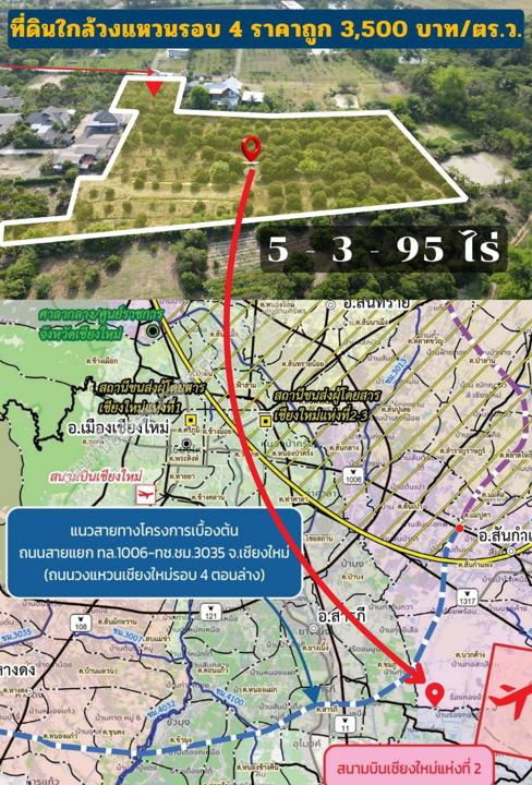 รายละเอียดเบื้องต้น : เนื้อที่ 5-3-95 ไร่ (2,395 ตร.วา) ราคาเพียง 3,500 บาท/ตร.วา โอนคนละครึ่ง ยังสามารถเก็บผลผลิตลำไยได้ต่อ เข้า-ออกสะดวก ถนนคอนกรีตถึงที่ดิน
